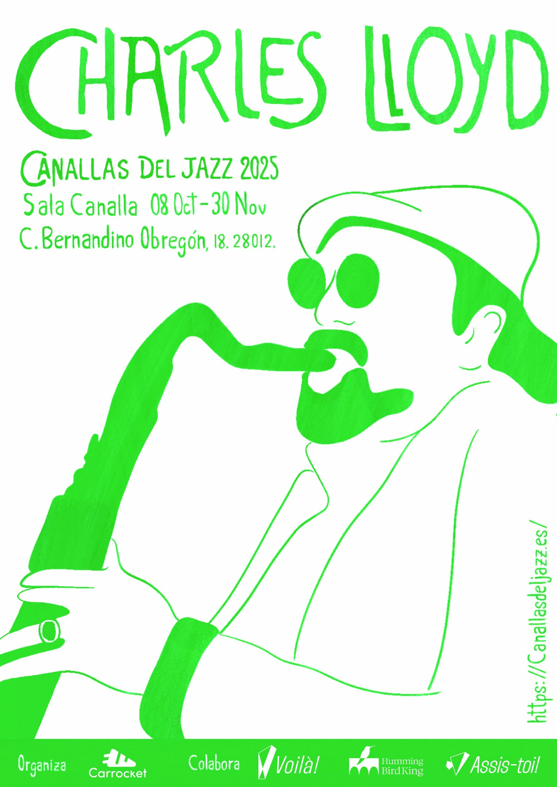 Cada cartel está ilustrado con una línea fluida y continua, dibujada en un solo color: azul, verde, rojo y naranja, que se unifica con la tipografía hecha a mano. El resultado es una propuesta vibrante y minimalista que refleja la improvisación y energía característica del jazz.